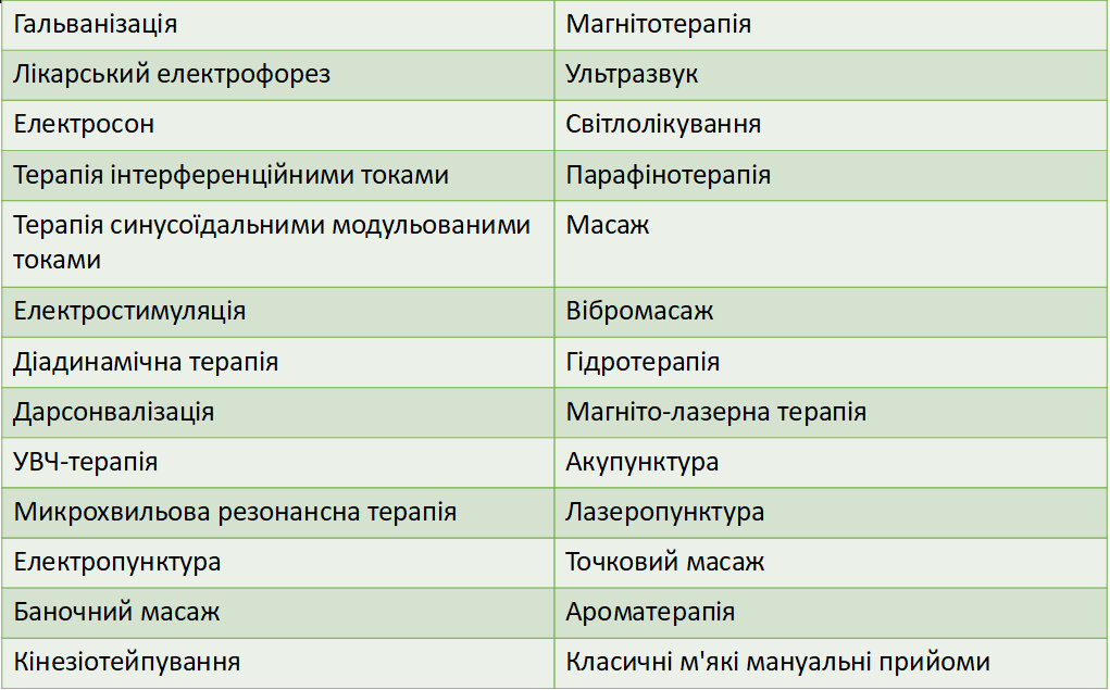 - Імпульсных струмів низької частоти (електросон, інтерференцтерапія, синусоідальні модульовані струми, електростимуляція, в тому числі багатоканальна);